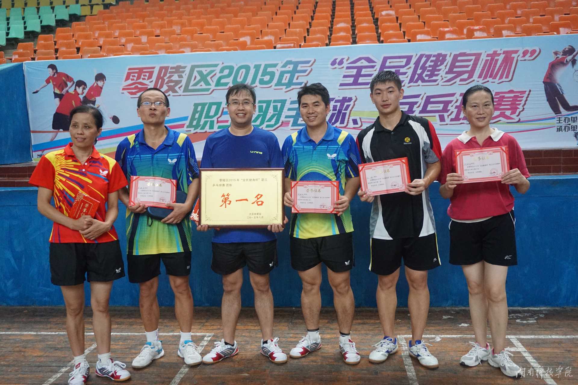 本网讯 8月14日,零陵区2015年“全民健身杯”职工羽毛球、乒乓球赛落幕。我校羽毛球队和乒乓球队奋勇拼搏,过关斩将,双双摘得团体桂冠。