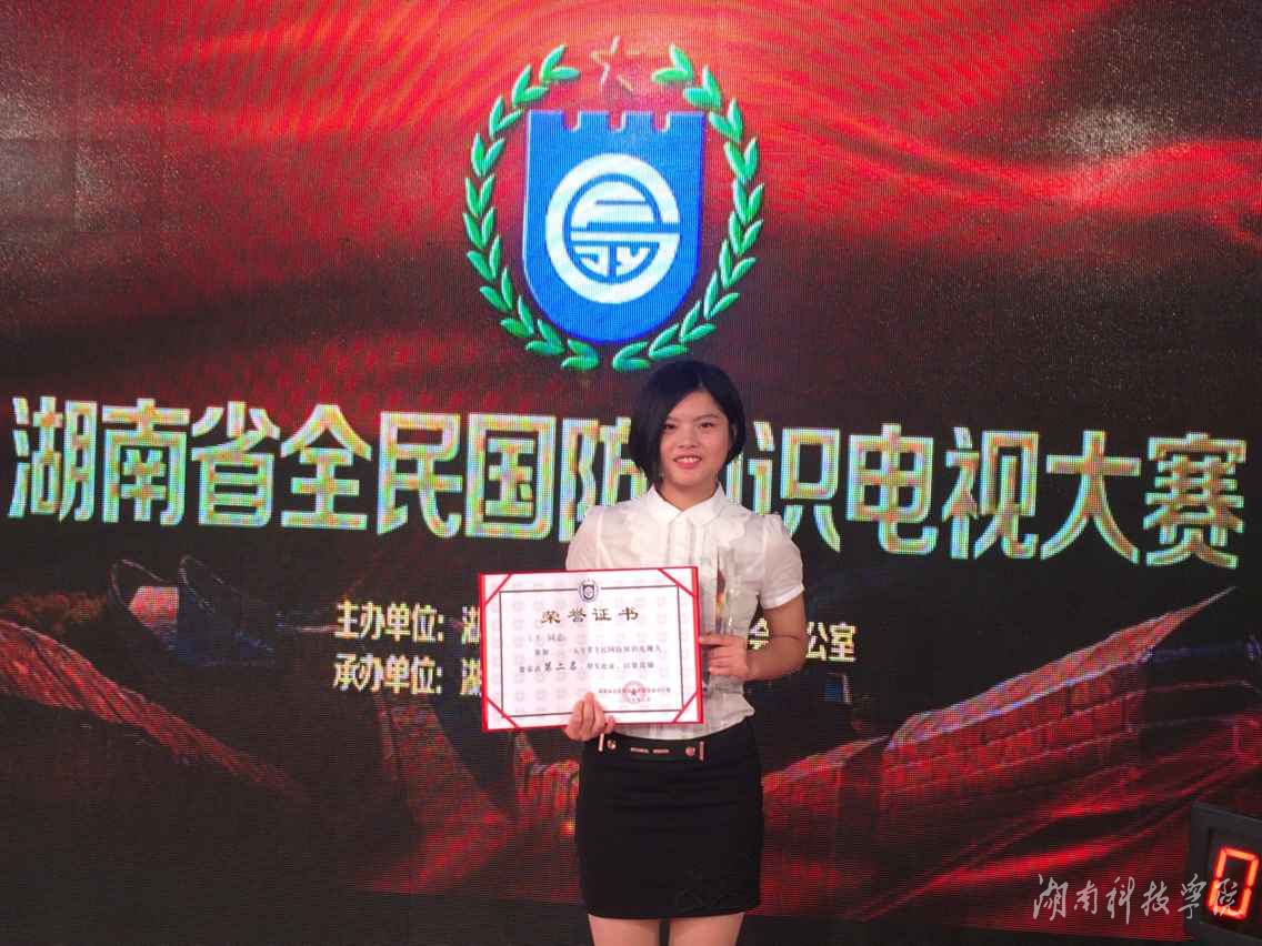 本网讯(通讯员 李红云)在7月7日举行的湖南省2015年全民国防知识电视大赛总决赛中,我校传媒学院学生金慧荣获亚军。