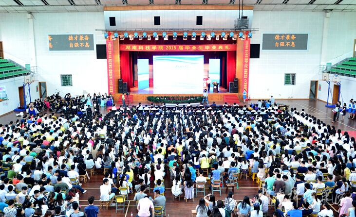 本网讯 (记者 乐为 摄影 秦峰 )“昔君来矣,细心求道,濡柳子高风,染潇湘神韵,九天雨露载桃李;今我往也,昂首人世,膺时代重任,践恩师明教,万里风云展鹗鹏”6月12日上午,学校在体育馆隆重举行2015届毕业生毕业典礼。3230名本科毕业生圆满完成学业,踏上新的人生征程。