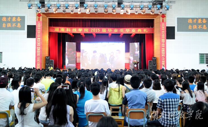 毕业典礼由2015届毕业生谌奥蕾、胡锦宇主持。 毕业典礼上,音乐与舞蹈学院乐队现场演奏毕业主题音乐,一曲作罢,全场掌声雷动,欢呼四起。充满美好回忆的大学生活短片,更是勾起了毕业生们对大学生活的无尽留恋。