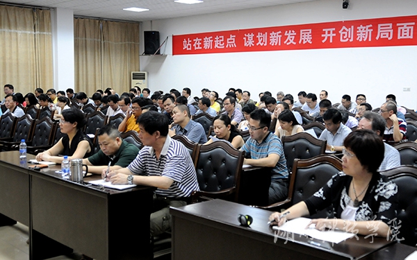 陈弘还以西班牙哲学家葛拉西安《智慧书》中的名言和曹操“割发代首”的历史典故教育党员干部以身作则、严以自律,切实牢记法制建设的“十二字准则”,即办事依法,遇事用法,难事靠法。“办好一所大学,就要回归教育本职,力戒浮躁,潜下心来抓教育、搞学术,不造声势、不做虚假。”陈弘热切教育广大党员干部脚踏实地工作,甘做大学精神的守望者。谈及学校改革发展的重点工作,陈弘详细解读了教育部出台的高等教育30条意见,他表示,要深化改革就需要群策群力,争做改革的带头人、领航人和促进者,以高度的责任感和主人翁意识开展工作,下一阶段在治理结构、人事分配制度、教育教学和人才培养模式改革等方面取得进展。
