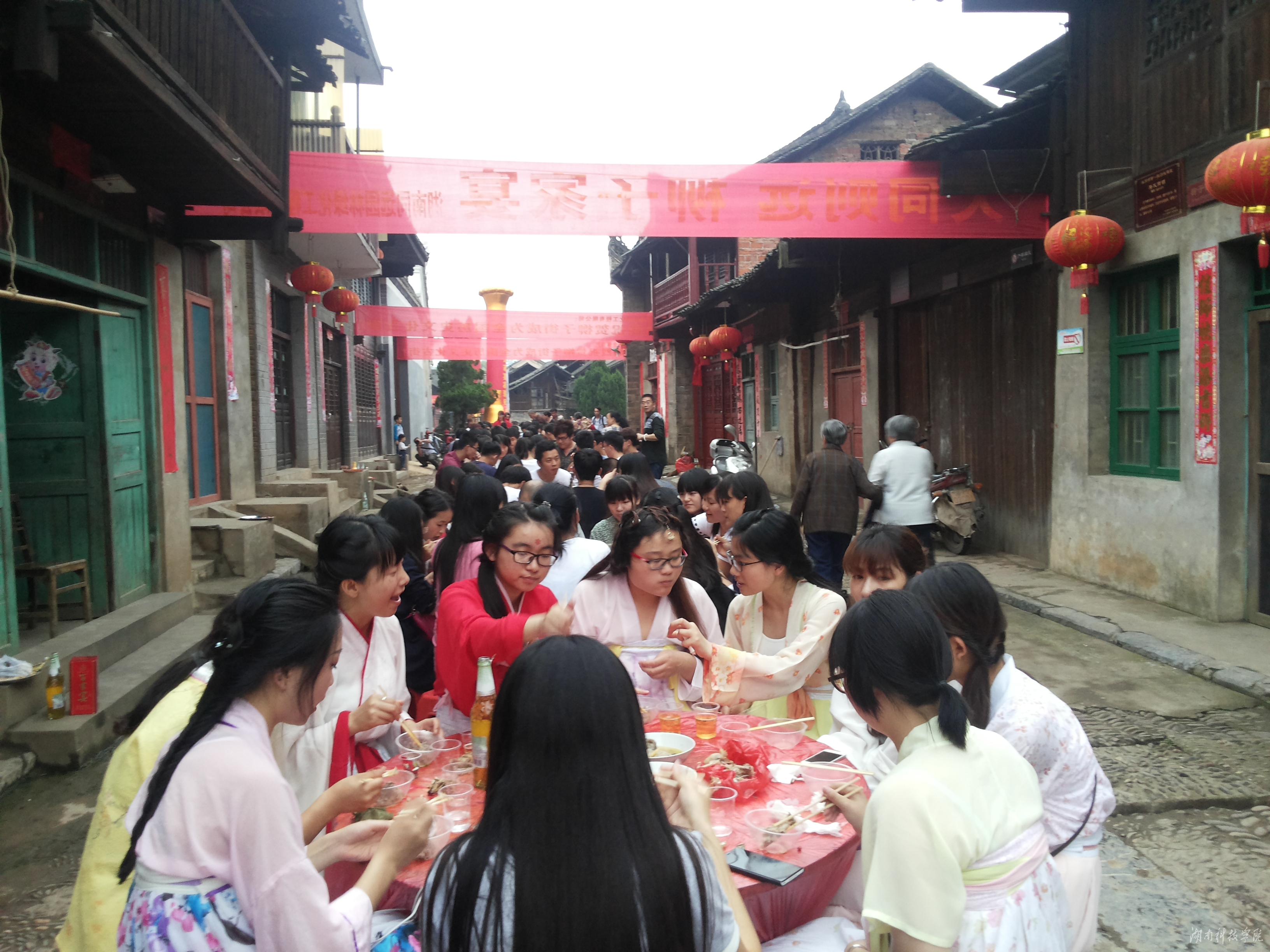 我校汉服社带来舞蹈《礼仪之邦》助兴开幕表演,以汉舞演绎和诠释汉文化的内涵,让大家感受到传统文化的魅力,赢得了阵阵掌声。近半个小时的文艺演出结束后,百家宴正式开席。只见柳子古街上,一张张铺红色桌布的圆桌沿青石板街道一字排开,桌上摆满各色美味菜肴。大家品菜肴,话家常,处处洋溢着浓浓的喜庆、和谐氛围。