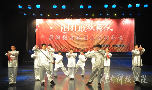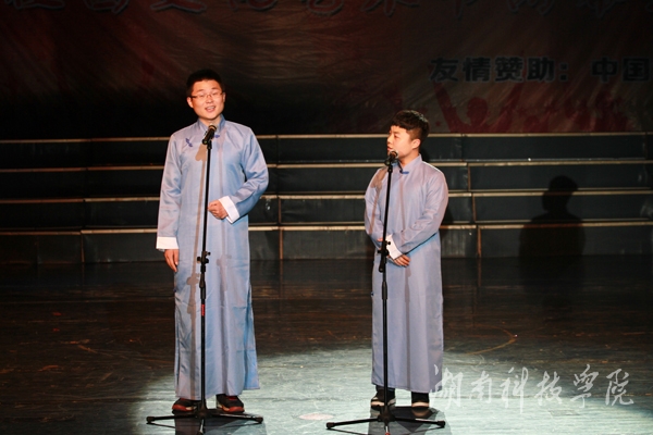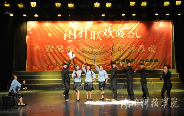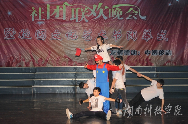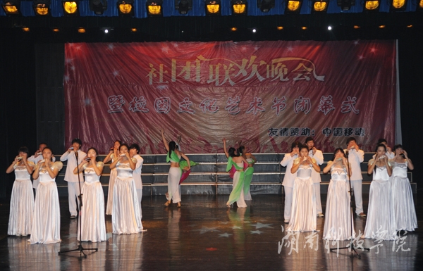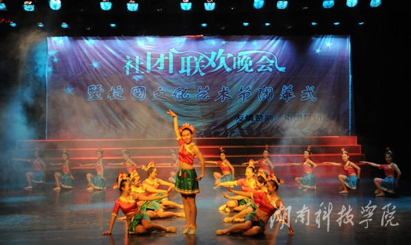 晚会在社团宣传片中拉开帷幕。轻快的旋律,动力十足的舞蹈《La song》迅速点燃全场气氛;由播音主持协会带来的《滑板鞋》以网络疯传的《我的滑板鞋》为背景音乐,优美的舞蹈与声情并茂的朗诵完美结合,以及略带诙谐的动作,赢得了观众的呐喊和震耳欲聋的掌声,一度把现场的气氛推向高潮;由绿色潇湘环保协会,秘书协会和我校志愿者协会合作的《T台秀》,将旧报纸,塑料袋等废弃物品做成的服装,或优雅大方,或粉妆玉琢,各种不同风格的服饰让同学们眼前一亮,真正做到了变废为宝;身着汉服的潇湘七兮汉服社为我们带来了舞台剧《烈烈衣冠·血色汉魂》,慷慨激昂、生动到位的表演,为我们展现了“宁为玉碎,不为瓦全”的古汉人的忠贞;风荷艺术团带来的哑剧《黄河大合唱》,夸张滑稽的动作,生动形象的表演引得现场掌声连连,笑声不断;街舞协会带来的街舞《童年的马里奥》,用马里奥救公主的故事诠释了英勇执着,动感的舞蹈,欢快的旋律给观众强烈的视觉冲击;雅韵陶笛社的乐器演奏《永远思念的故土》则唯美悦耳、宛转悠扬,为大家奉献了精彩的视听盛宴。空手道协会则以剑,棍,等传统武器向同学们展示了中国传统武术的魅力。
