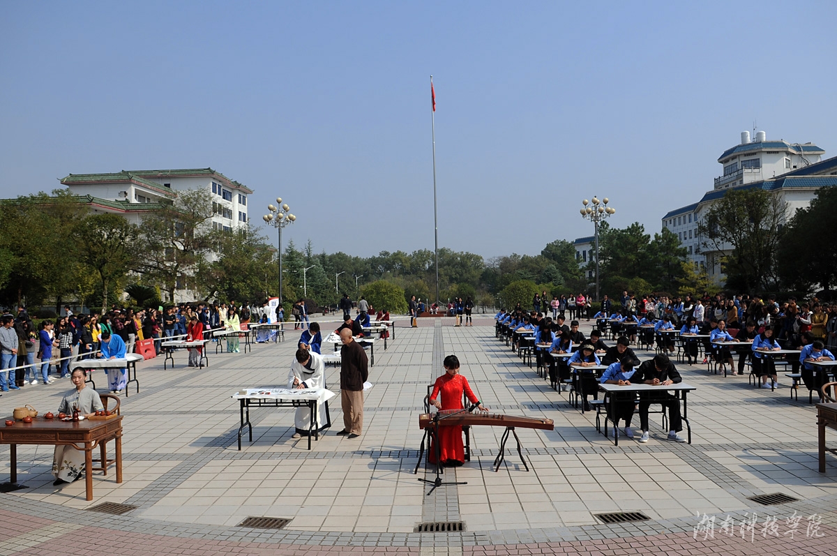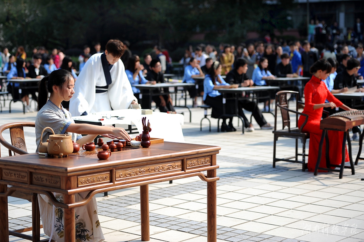 本网讯 (记者李瑛 摄影 何帅文 李国家) 枫红寒露染潇湘,琴醉茶道翰墨香。11月14日,我校近千名师生陶醉在悠扬婉转的古筝声中,闻着淡淡的茶香,欣赏了一场学子着汉服、民国服装现场挥毫泼墨的弘扬传统文化的视觉盛宴。