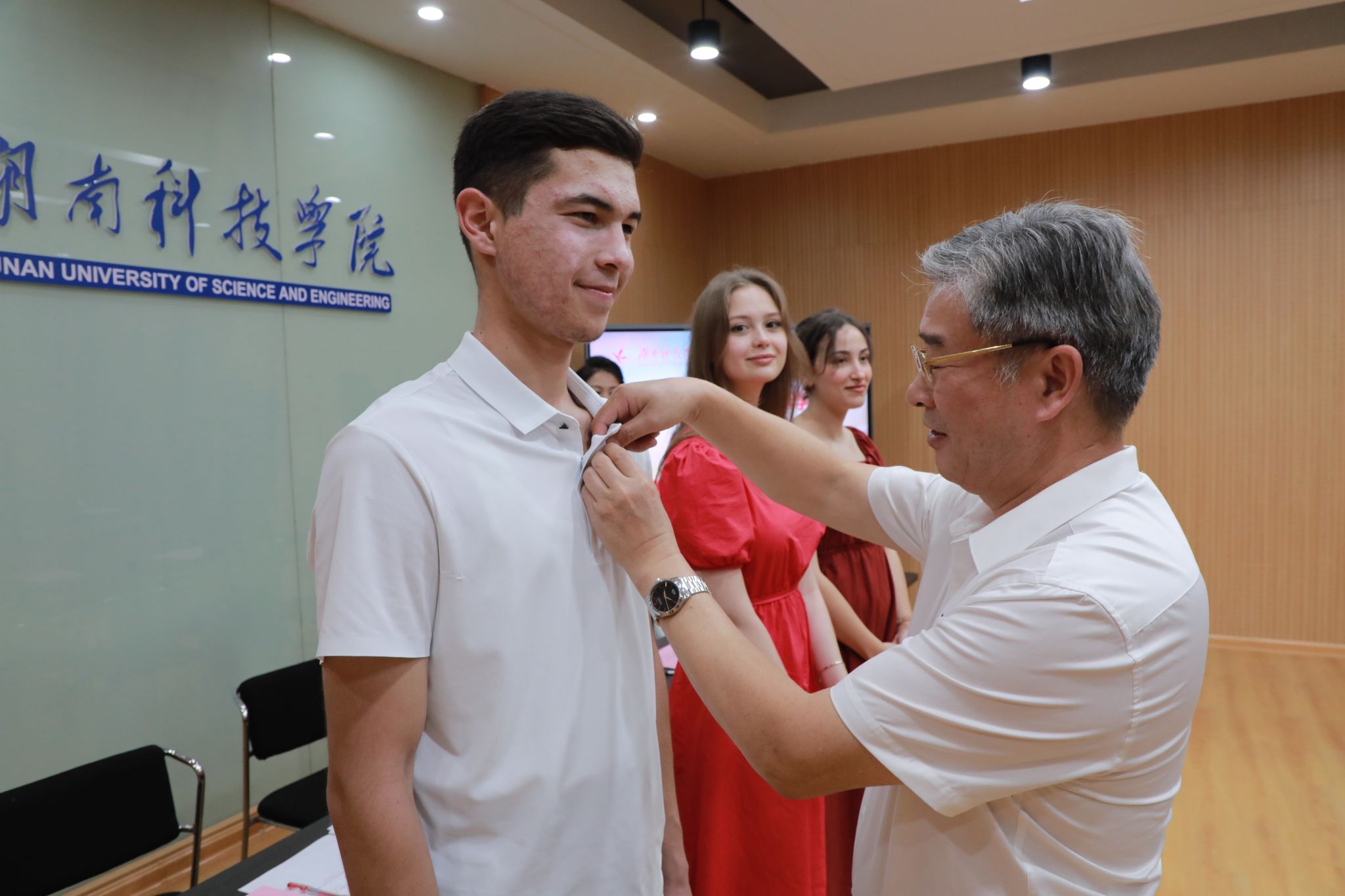 宋宏福为国际学生代表佩戴校徽,期待新同学们怀着梦想与希望在学校开启青春华章,追逐人生梦想。