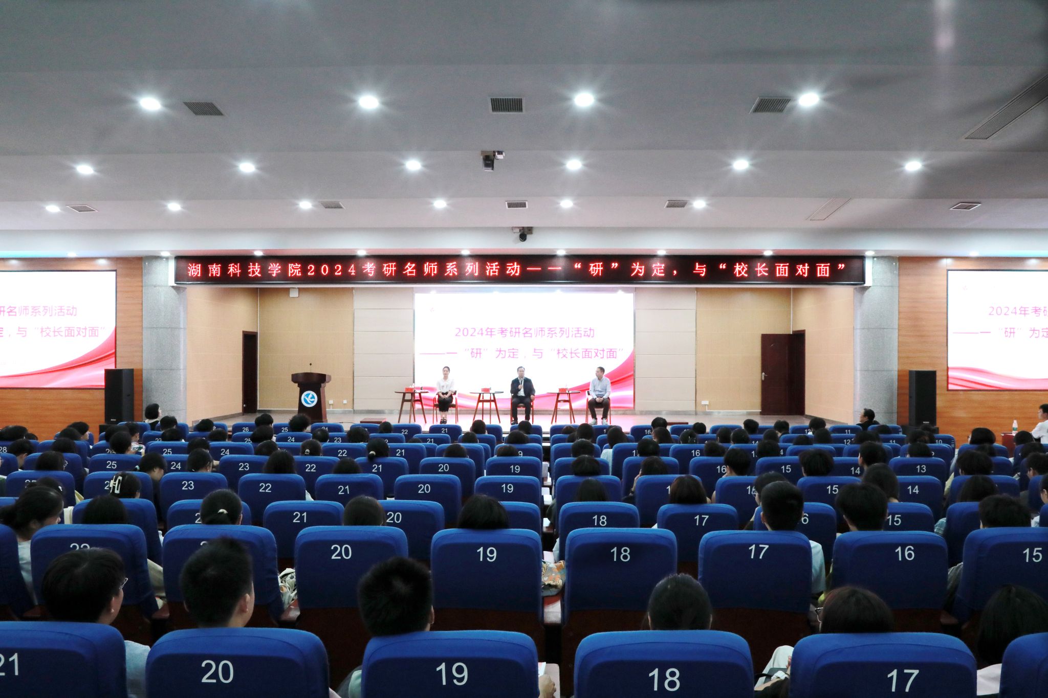 本网讯(通讯员 吕文青)10月10日,学校在潇湘大讲堂举行2024年考研名师系列——一“研”为定,与“校长面对面”活动。活动特邀学校党委副书记、校长黄创霞教授出席活动,还邀请外国语学院副院长胡维博士,马克思主义学院专任教师邓昱全博士参加活动,与学校2022级、2023级有考研意向的学生亲切交谈、分享经验。