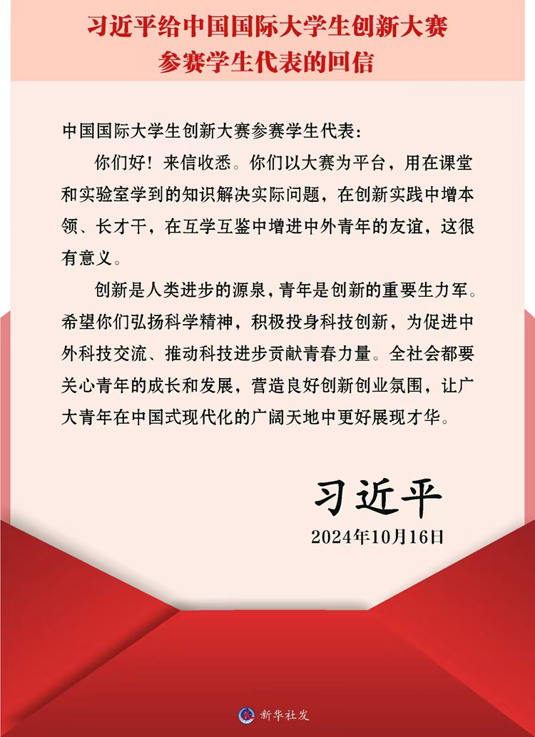 10月16日,中共中央总书记、国家主席、中央军委主席习近平在给中国国际大学生创新大赛参赛学生代表的回信中提到:“你们以大赛为平台,用课堂和实验室学到的知识解决实际问题,在创新实践中增本领、长才干,在互学互鉴中增进中外青年的友谊,这很有意义。”下一步,我校将认真学习习近平总书记重要回信精神,以创新大赛为契机,将其作为创新型人才培养的重要环节,鼓励学科交叉融合、协同创新,促进学生全面发展,深入推进人才培养模式改革,探索构建起“联结、赋能、服务”体系下的“三融四促”创新创业人才培养模式。