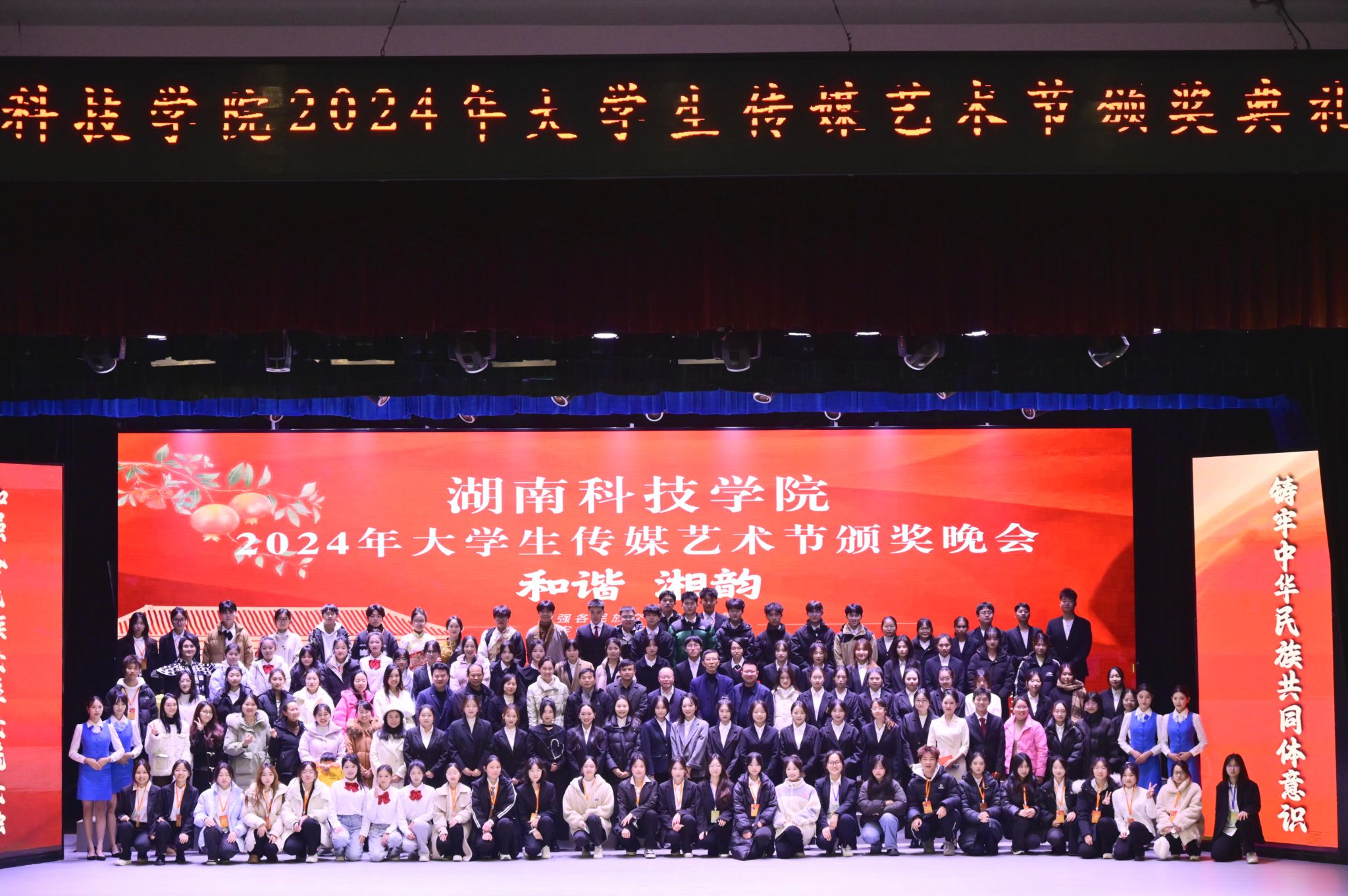 本网讯(记者 袁馨)12月12日晚,我校在音乐厅举办“和谐湘韵:铸牢中华民族共同体意识”大学生传媒艺术节颁奖晚会。校党委委员、纪委书记陈灿军,校党委委员、副校长何海,宣传统战部常务副部长林泽红,永州市融媒体中心新媒体与技术保障部主任赵小兵,零陵区委宣传部副部长龙咏雪出席晚会。
