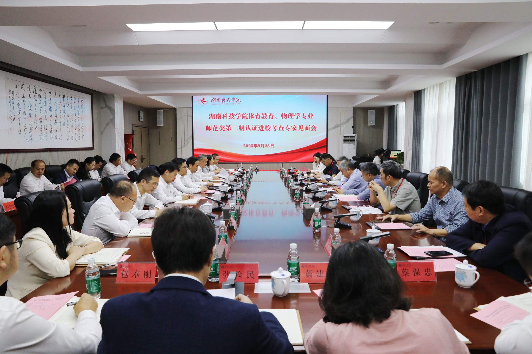本网讯(记者 孙淑娴 摄影 谢志豪)9月25日,学校召开体育教育、物理学两个专业师范类二级认证专家见面会,两个专业联合认证专家组全体专家,全体在校校领导、党委委员出席见面会。见面会分两个阶段,校党委委员、副校长何福林主持第一阶段会议。