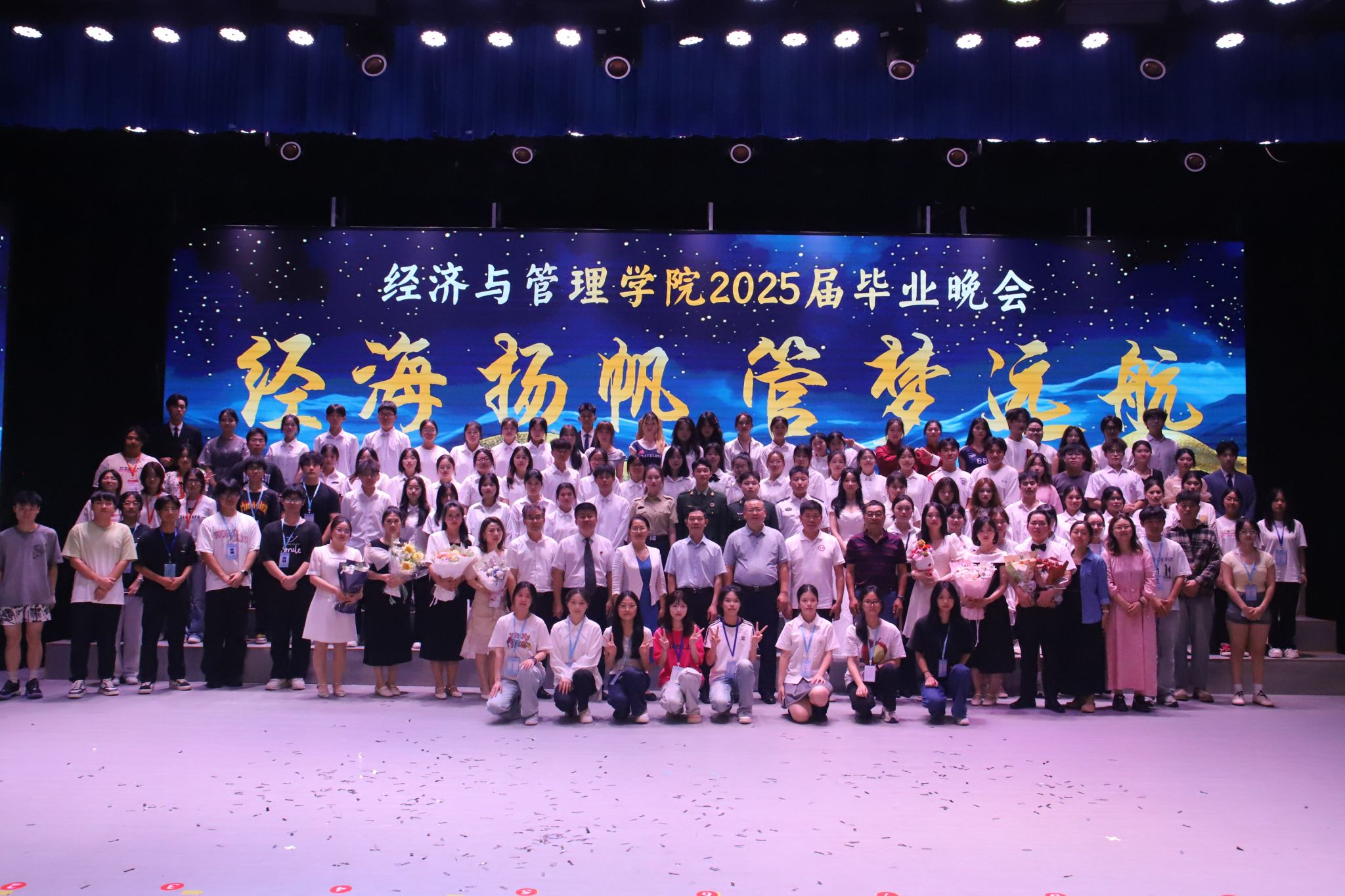 本网讯(通讯员 李晓)5月23日晚,经济与管理学院在大音乐厅举办2025届毕业晚会,活动邀请了相关校领导出席,经济与管理学院相关院领导、辅导员、毕业班师生一同相聚,共赴“盛宴”。