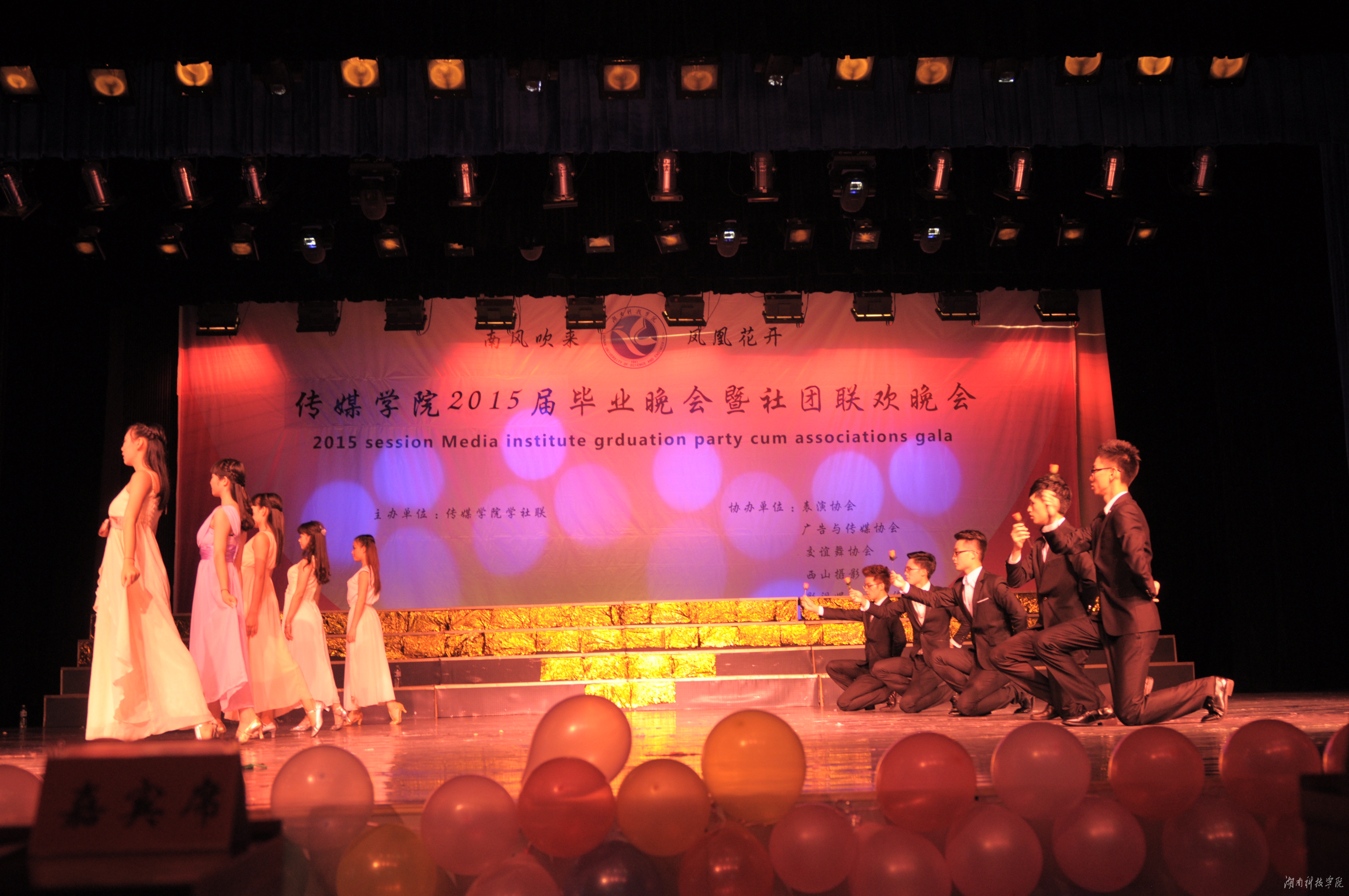 钟飞宇、赵彤、黄洛羽、白雷担任主持人。冰点、王者归来乐队激昂热烈的《歌曲串烧》拉开了晚会的序幕,迅速带动起现场气氛。表演协会带来动感活力的舞蹈《Up down》和时尚前卫的T台秀表演,嗨翻全场,不断引来台下观众的尖叫声。小品《致青春》则以幽默诙谐的方式鼓励毕业生直面进入社会的困境,相信自己,执着追求。“挥挥手告别欢乐和无奈,时光好似流水飞快,日日夜夜将我们的青春灌溉”这首《栀子花开》唱出毕业生对大学校园的怀恋;刘晓慧老师倾情献唱《可惜不是你》,表达了离别的不舍,感恩在最美的时光相遇。交谊舞协会表演的探戈和华尔兹浪漫优雅。两段视频则将整场晚会引向高潮,记录了2015届广电、广告、媒体四个专业的243名毕业生从入学到毕业四年的大学时光,更有班主任寄语真挚动人,流露出离别的浓浓深情。优秀毕业生陈秋璇表示参加过三次毕业晚会,唯有自己毕业时不能赶到现场,她通过视频方式感恩母校。