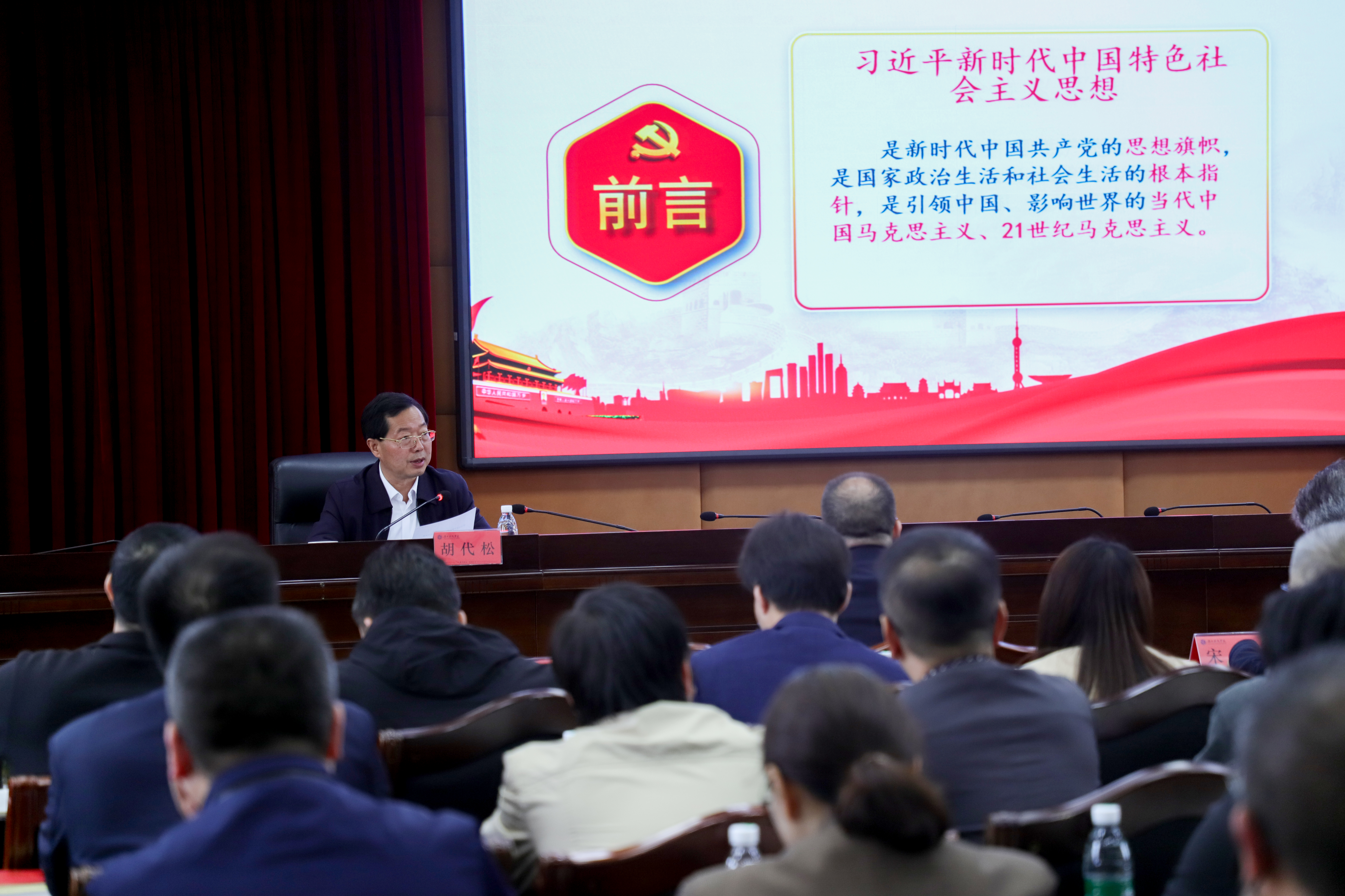 本网讯 4月27日上午,学校学习贯彻习近平新时代中国特色社会主义思想主题教育读书班专家辅导报告会在行政楼八楼一会议室举行。湖南省社科联党组书记、副主席(主持日常工作)胡代松为全体学员作专题辅导报告。校党委副书记、校长李钢主持报告会。
