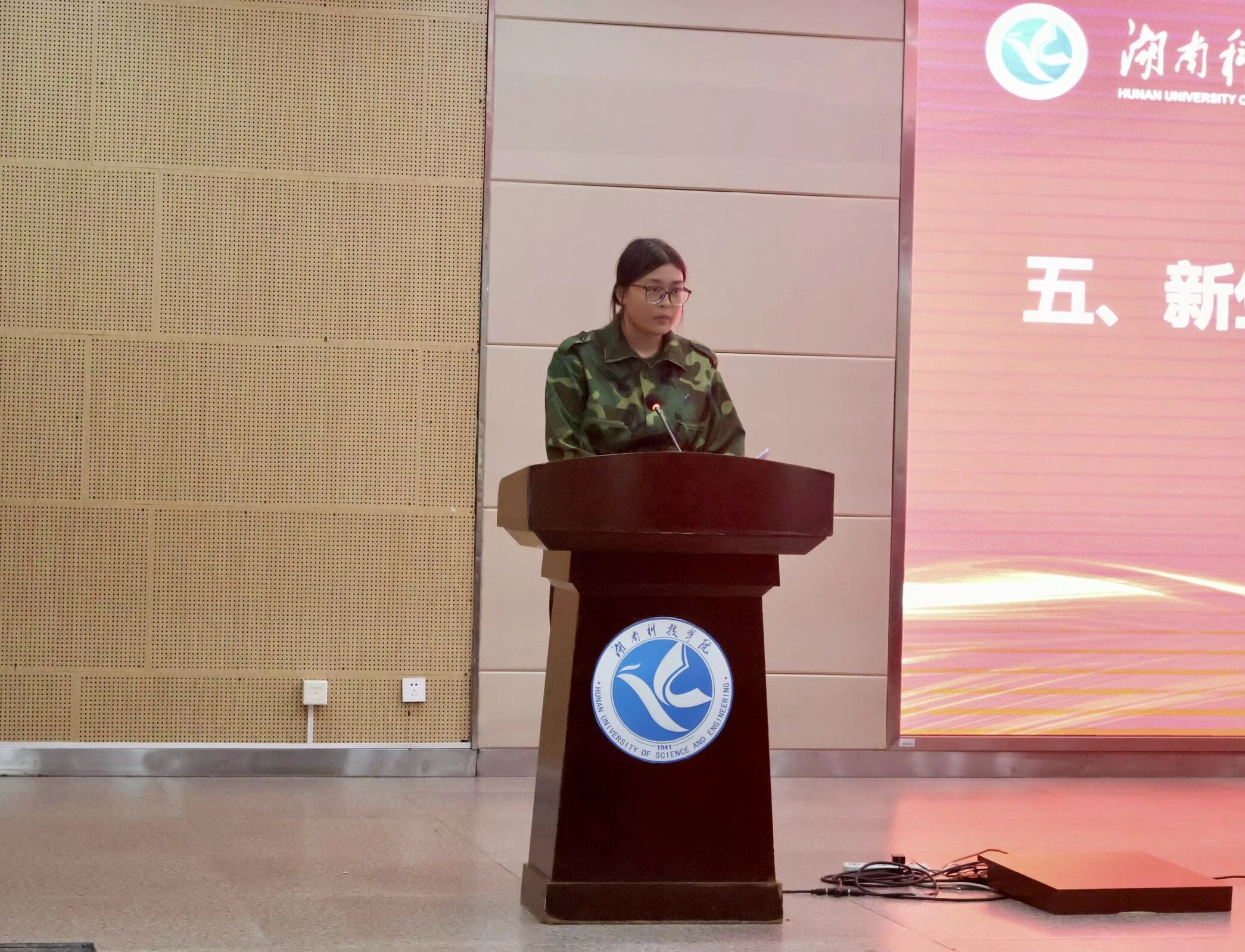随后,教师代表、国家级一流课程负责人郭恩平副教授以 “探索、积累、突破” 为关键词,结合自身教学科研经历,勉励新生既要科学规划大学时光,扎实掌握专业基础,也要主动参与实践创新,在探索中积累经验,在积累中实现突破,以真才实学扛起时代赋予的责任。校长奖学金团体奖获得者代表、建筑 2202 班吴启同学分享了自己在学科竞赛、志愿服务中的成长故事,鼓励学弟学妹们大胆尝试、勇于挑战,在多元实践中发掘潜力,书写独一无二的青春篇章。新生代表、土木 2502 班张子芊同学则代表全体 2025 级新生表态,将以 “德才兼备、自强不息” 的校训为指引,坚定理想信念,勤学笃行、不负韶华,在湘科院的沃土上追逐梦想、成长成才。