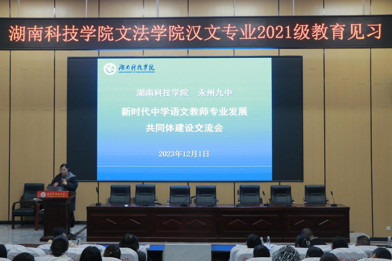 本网讯(通讯员:李惊宇 梁怡)为增强汉语言文学专业学生对专业技能的掌握,深化专业理论知识的理解,实现知识向实践的转化,提升教育教学能力,12月1日,在学院实习研究队宋艳旭老师和各班领队老师及辅导员龙慧老师的带领下,2021级汉语言文学专业学生前往永州市第九中学开展教育见习活动。出席本次会议的有文法学院院长谷显明教授,副院长肖智成博士,Beat365唯一官方网站语文教育研究中心主任刘忠华老师,中文系副主任尹华君老师以及永州市九中教师团队和21级全体汉文专业学生。