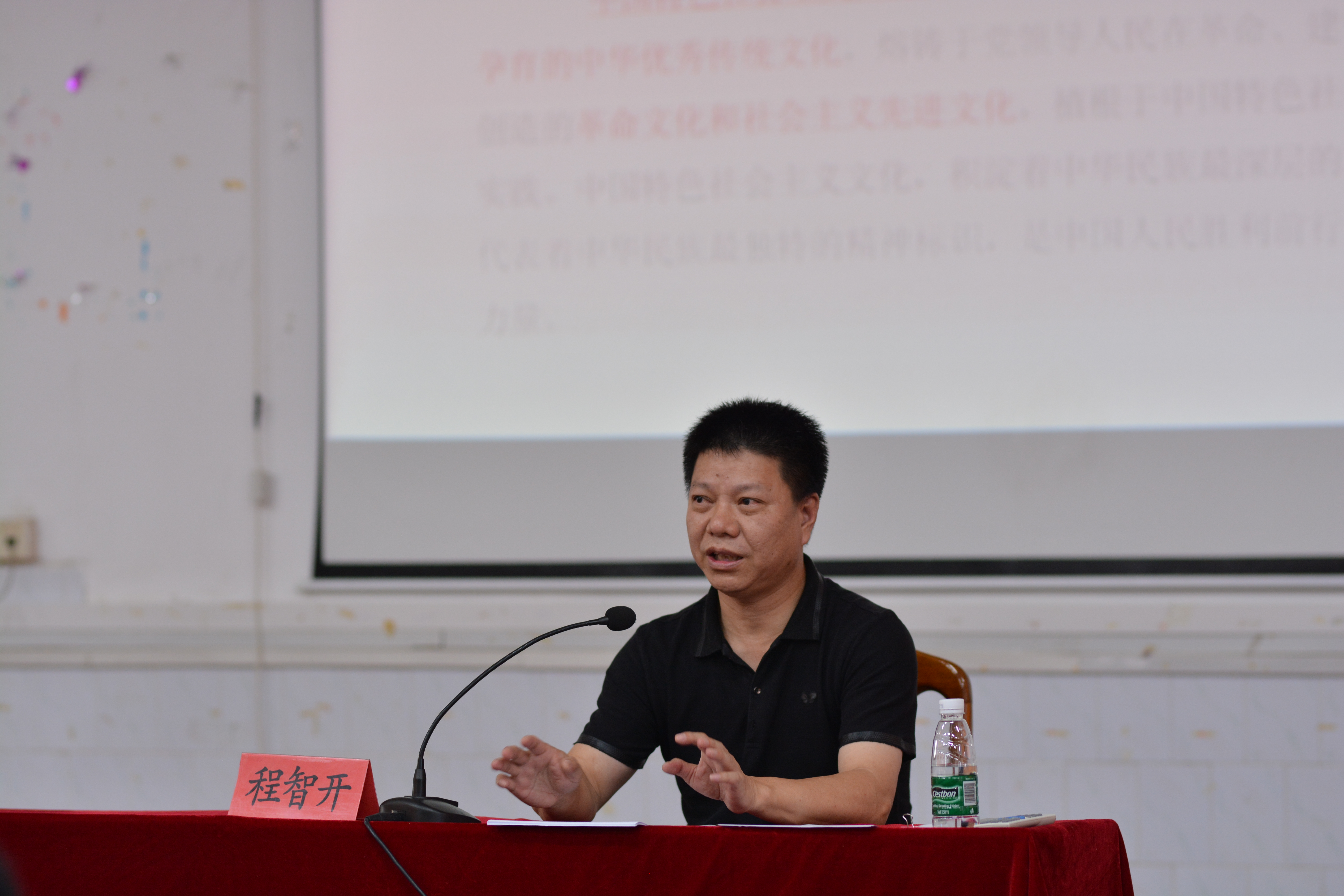 在题为《坚定中国特色社会主义“四个自信”》的党课程智开从提出过程、主要内容、辩证关系三个方面深入阐释了“四个自信”的科学内涵;指出“四个自信”的主要依据来自先进理论指导、成功实践证明和中国特色社会主义的优势与贡献。程智开指出我们应该在学习研究中实现“四个自信”,在比较鉴别中坚定“四个自信”,在创新实践中提升“四个自信”。