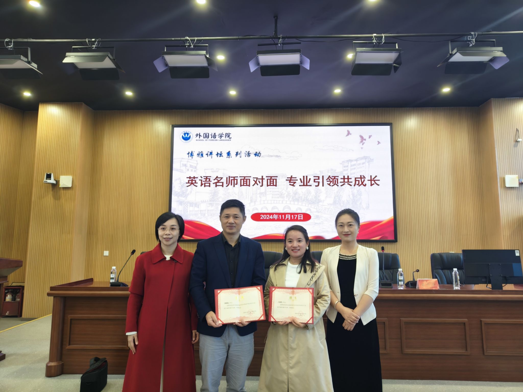 活动最后,外国语学院举行了校外兼职导师受聘仪式。学院领导为黄琼、杨超标、吕阎华和黄建华等四位嘉宾颁发了校外兼职导师聘书,并希望他们能够在今后的工作中继续关心和支持外国语学院的发展,为学院的人才培养和专业建设贡献智慧和力量。