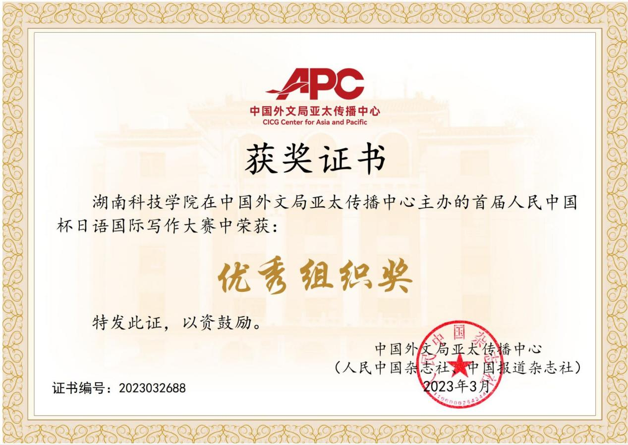本网讯(通讯员 宋琳)2月底,由中国外文局亚太传播中心(中国外文局、中国报道杂志社)主办、广东省翻译协会承办的首届“人民中国杯”日语国际写作大赛获奖名单揭晓。在何建军、阳芹、黄警慧等老师的指导下,我院喜获优秀组织奖,杨薇同学获本科组二等奖,罗露、宋嘉笛、孙文婷、王炳蓉、周婷娥、夏宇茜等6名同学获本科生组三等奖。