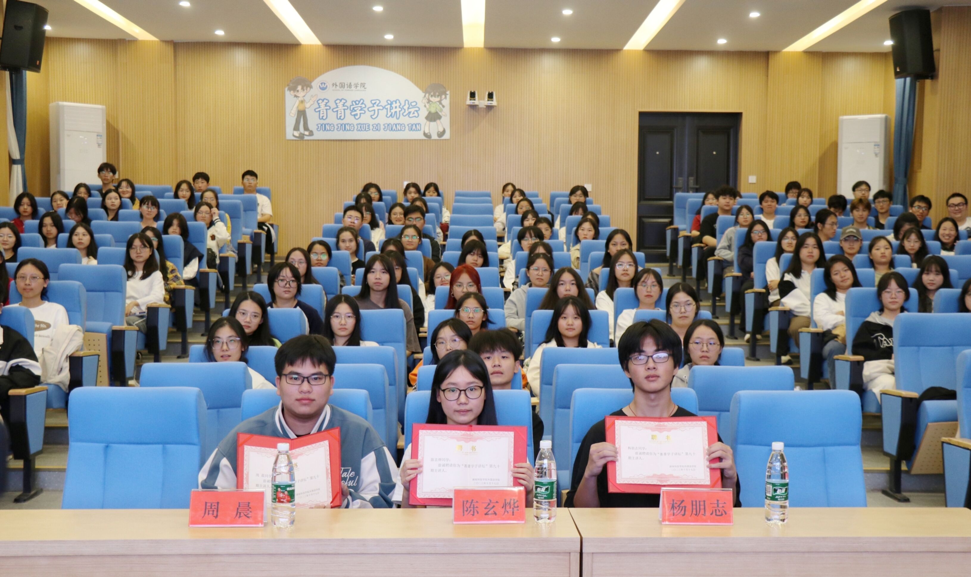 (通讯员 陈昊 摄影 刘李娟)10月17日19:10,外国语学院在博雅楼东三教室举行以“微光烬明,踔厉奋发”为主题的第九十期菁菁学子讲坛。本次活动邀请日语2101班杨朋志、商务英语2203班陈玄烨、英语师范2103班周晨作为主讲人。全院共有180多名同学参与讲座。