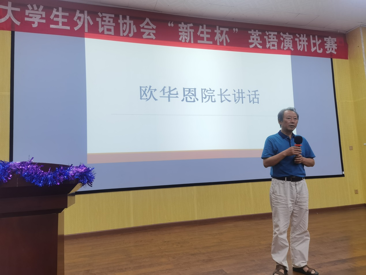 比赛最后,欧华恩院长上台对选手们的表现进行了点评,提出表扬的同时,也指出了许多不足。他表示英语演讲的学习过程中需要有长征精神,英语演讲之路中一定是会存在挫折与困难,但一定要勇往直前。他表示,自信,永远是演讲中不可缺少的一部分。