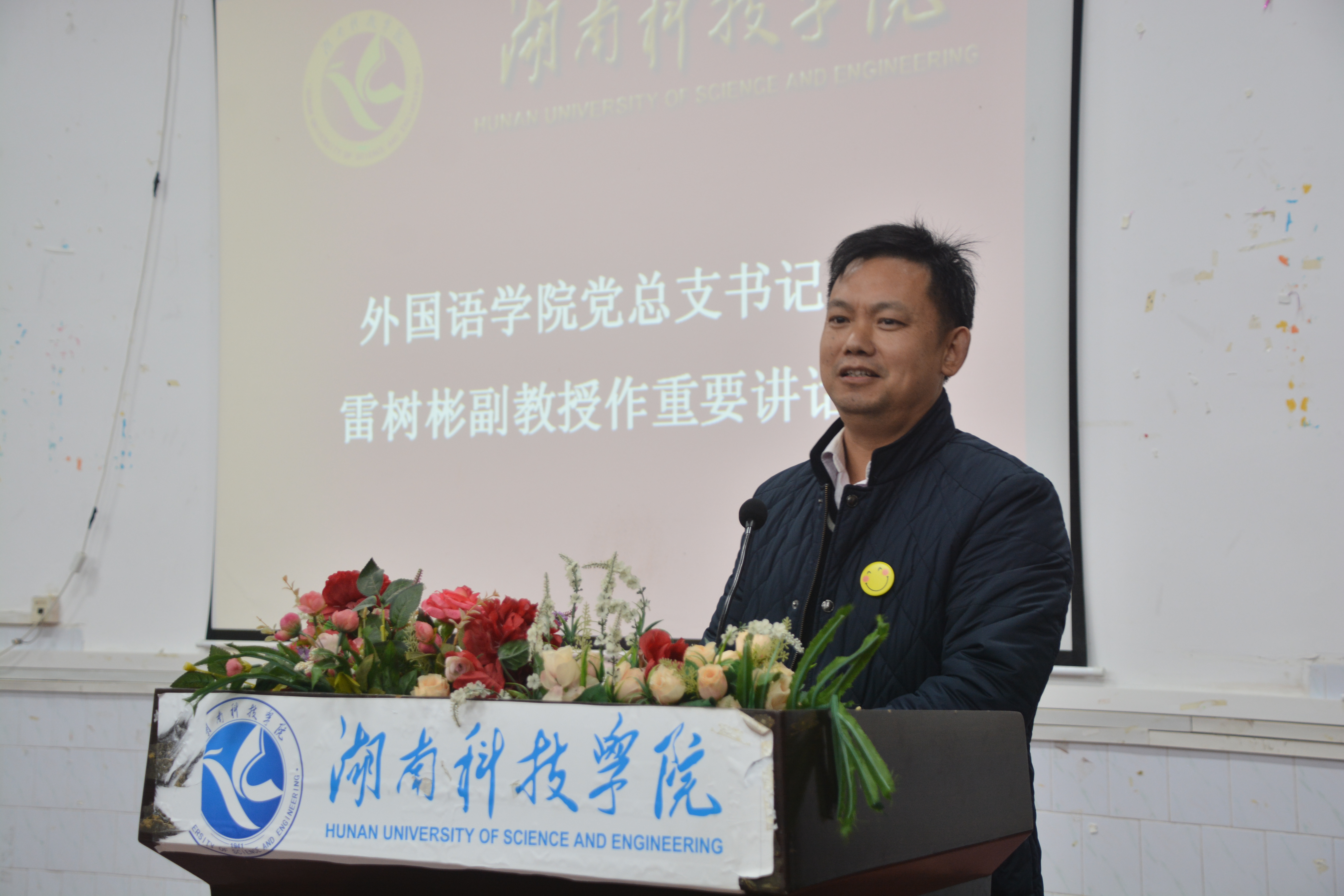 接下来,外国语学院党总支书记雷树彬作讲话,他在讲话中强调,同学们在与人交往的过程中要做到“有礼、有节、有度”。他提议心理教育工作者充分发挥网络媒体作用,通过朋友圈捕捉信息,为工作提供帮助。