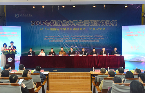 本网讯 11月11日,由湖南省教育厅主办,我校与湖南省高等教育学会日语专业委员会共同承办的2017年湖南省大学生日语演讲比赛在我校尚美楼演播厅举行。省教育厅副厅长葛建中,省教育厅高教处处长曾力勤,省日语专业委员会会长张佩霞,省教育厅高教处副处长杨承玖,省教育厅高教处调研员张琳,我校校长曾宝成,副校长李常健出席开幕式。
