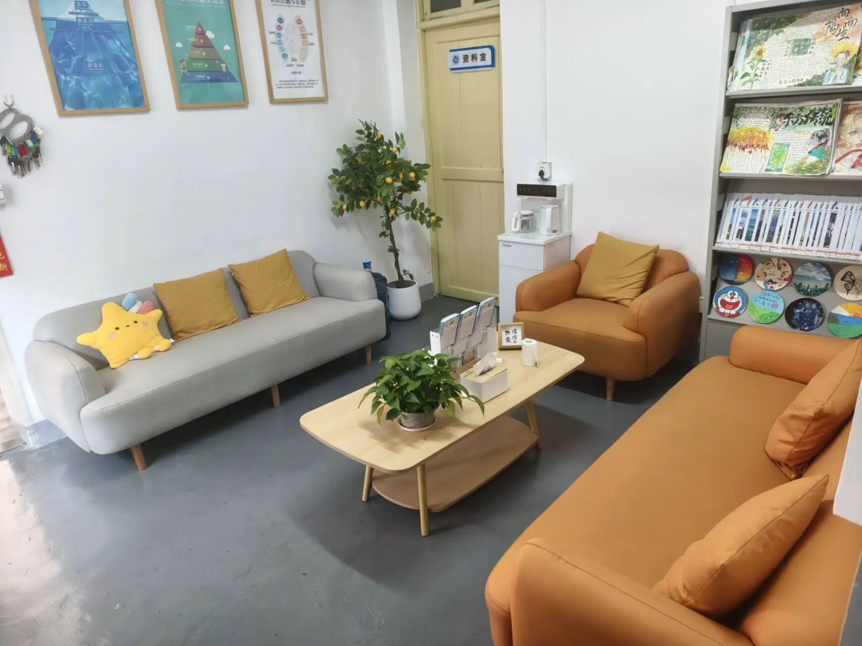 接待室内有休息椅,茶水和心理期刊。是日常接待来访学生、预约登记、填写相关材料、接听热线电话的心理第一站。