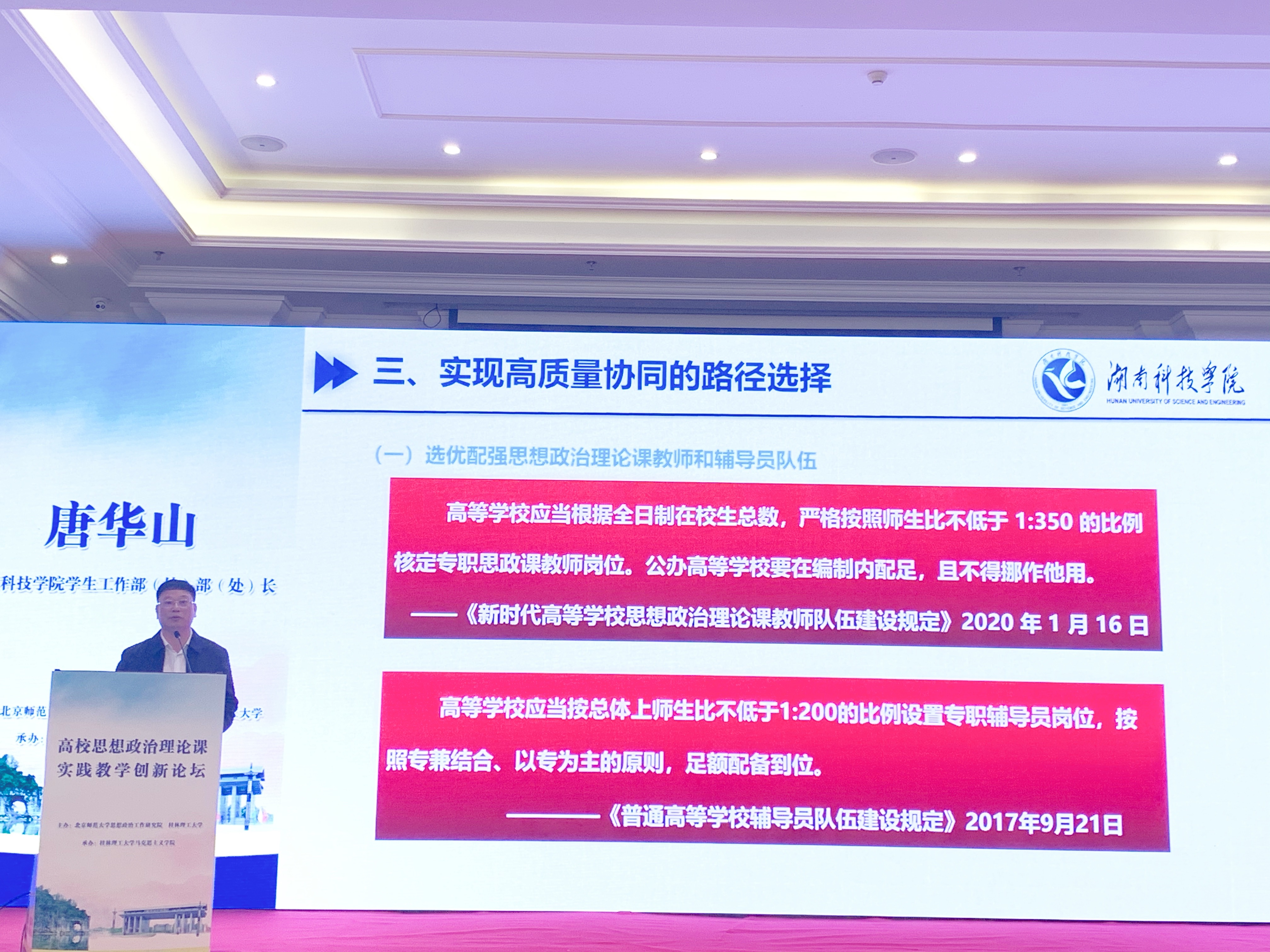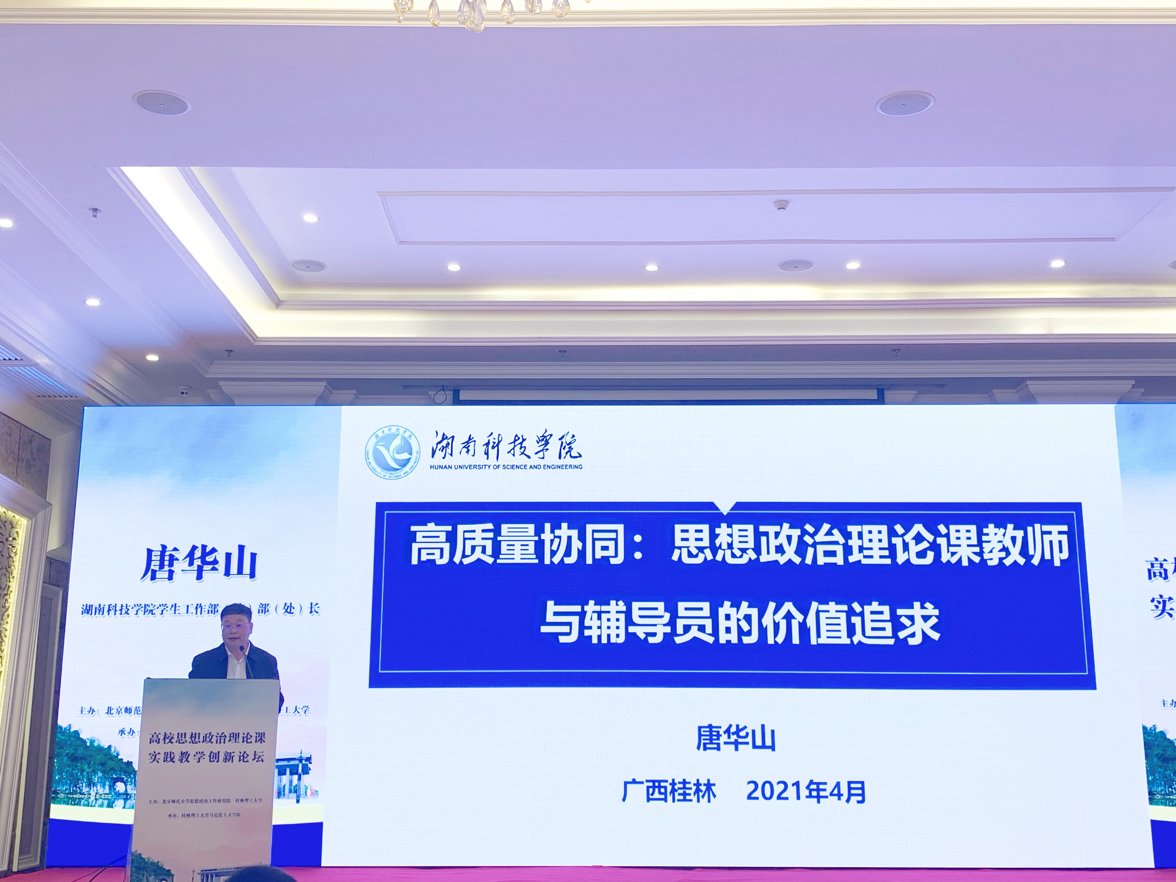 4月10日,由北京师范大学思想政治工作研究院和桂林理工大学共同举办的高校思想政治理论课实践教学创新论坛暨“教育部高校示范马院和优秀教学团队建设重点项目”成果发布会在桂林召开。我校学工部长唐华山应邀参会,并作题为“高质量协同:思想政治理论课教师与辅导员的价值追求”的主题报告。