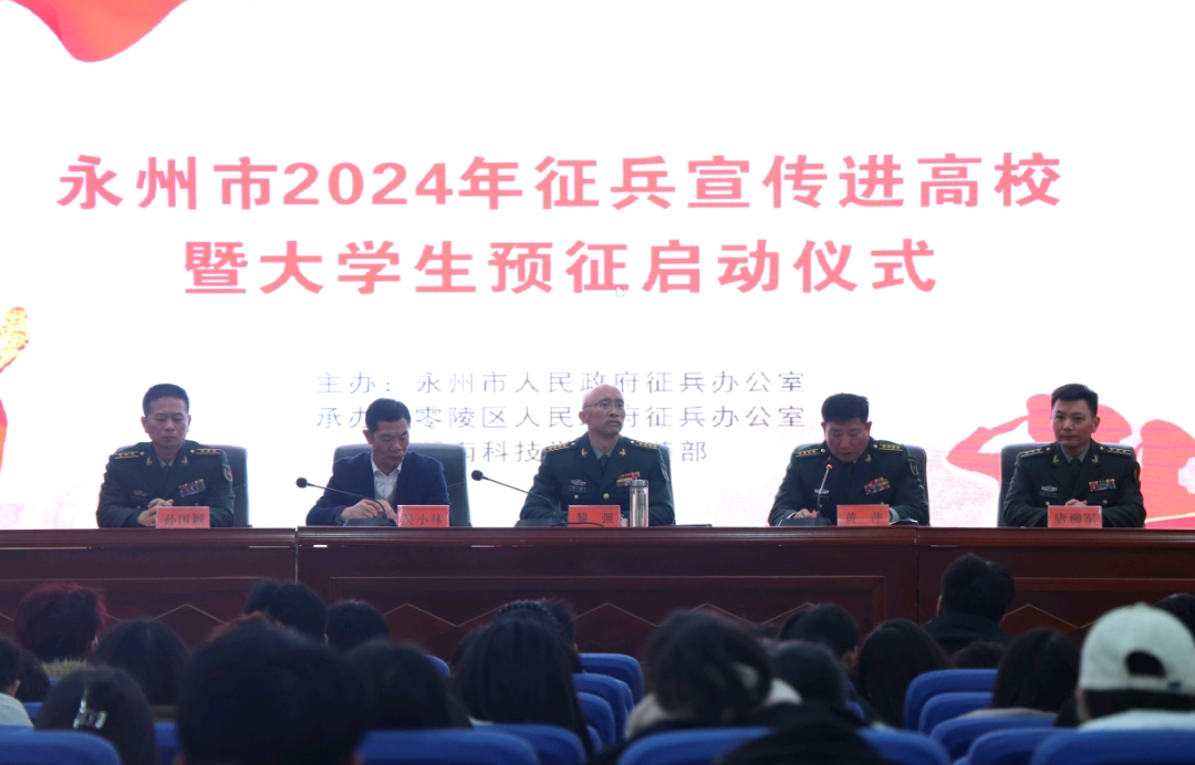 本网讯(学工部)12月28日,永州市2024年征兵宣传进高校暨大学生预征启动仪式在我校举行。永州军分区司令员黎强出席并讲话,永州市委常委、军分区政委张嘉庆出席,永州军分区副司令员黄萍主持仪式,Beat365唯一官方网站党委委员、副校长吴小林,永州军分区动员处处长唐柳军,零陵区人武部政委孙国颖出席活动。