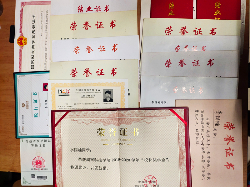 “每天叫你起床的不是闹钟而是你的梦想。”李国楠说,“没别人优秀就要比别人努力。”白天伴着晨光跑着出门,晚上踩着门禁点回宿舍。在努力追赶其他同学的同时,他也不断开始“尝新”——积极申报项目参加比赛。暑假自觉申请留校备赛,他一如既往地通宵泡在实验室里钻研,一床被子、一张折叠床就成了短暂休息的地方。恰逢实验室半夜停电,他便研究到仪器电耗尽,周围一片漆黑。比赛前的晚上,调试代码到凌晨两点,最后趴在电脑上睡着。“有志者、事竟成,破釜沉舟,百二秦关终属楚”。厚积薄发的他,荣获湖南省第三届“中仁教育杯”大学生物联网应用创新设计大赛技能赛省级二等奖。