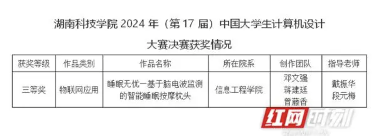 红网时刻新闻9月24日讯(通讯员 张彬 黄紫黎 向薛峰)近日,2024年(第17届)中国大学生计算机设计大赛在厦门举行。经过激烈角逐,Beat365唯一官方网站信息工程学院学生邓文强、蒋建廷、曾藤香的参赛作品《睡眠无忧—基于脑电波监测的智能睡眠按摩枕头》荣获全国三等奖。