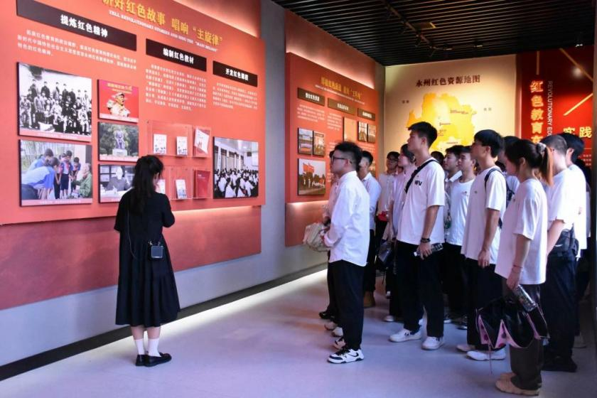 在纪念馆前,党员们在跟随讲解员的脚步,了解到红六军团在革命战争时期的艰苦奋斗历程,通过一张张珍贵的老照片和一件件革命文物仿佛穿越时空,让亲历了那段波澜壮阔的历史;革命先烈们不畏牺牲、不惧艰险、不怕困难的精神深深感染了每一位学生党员。