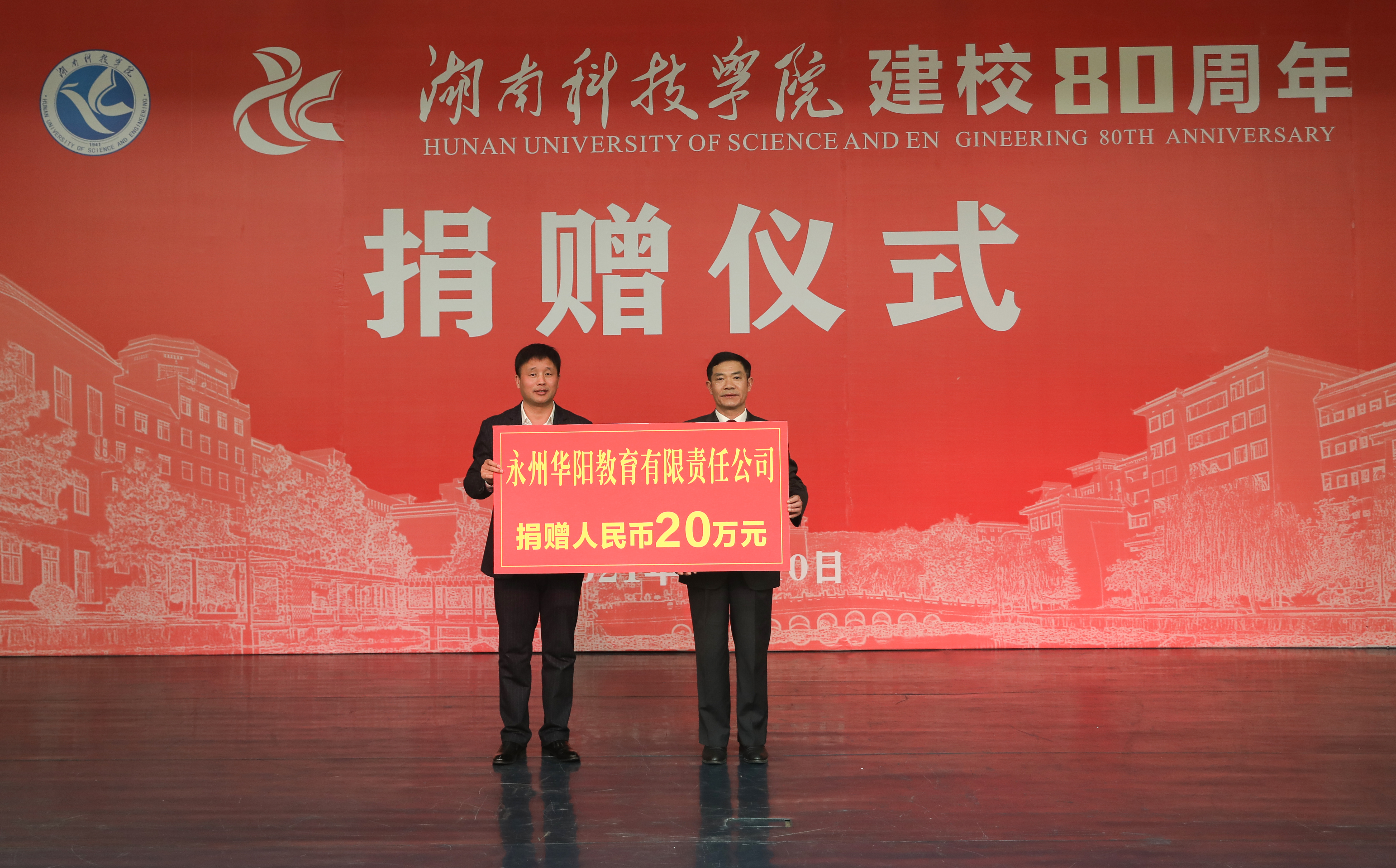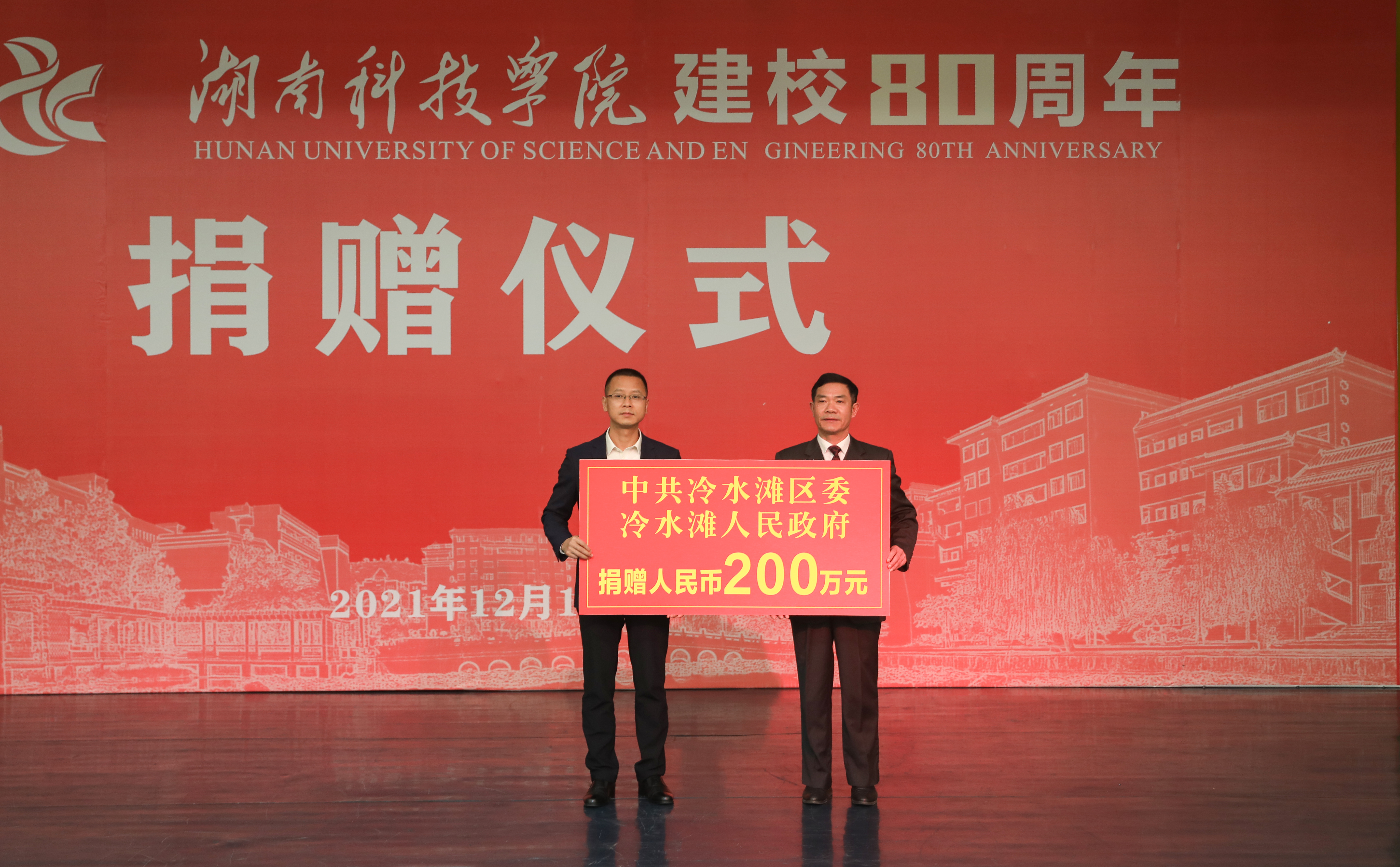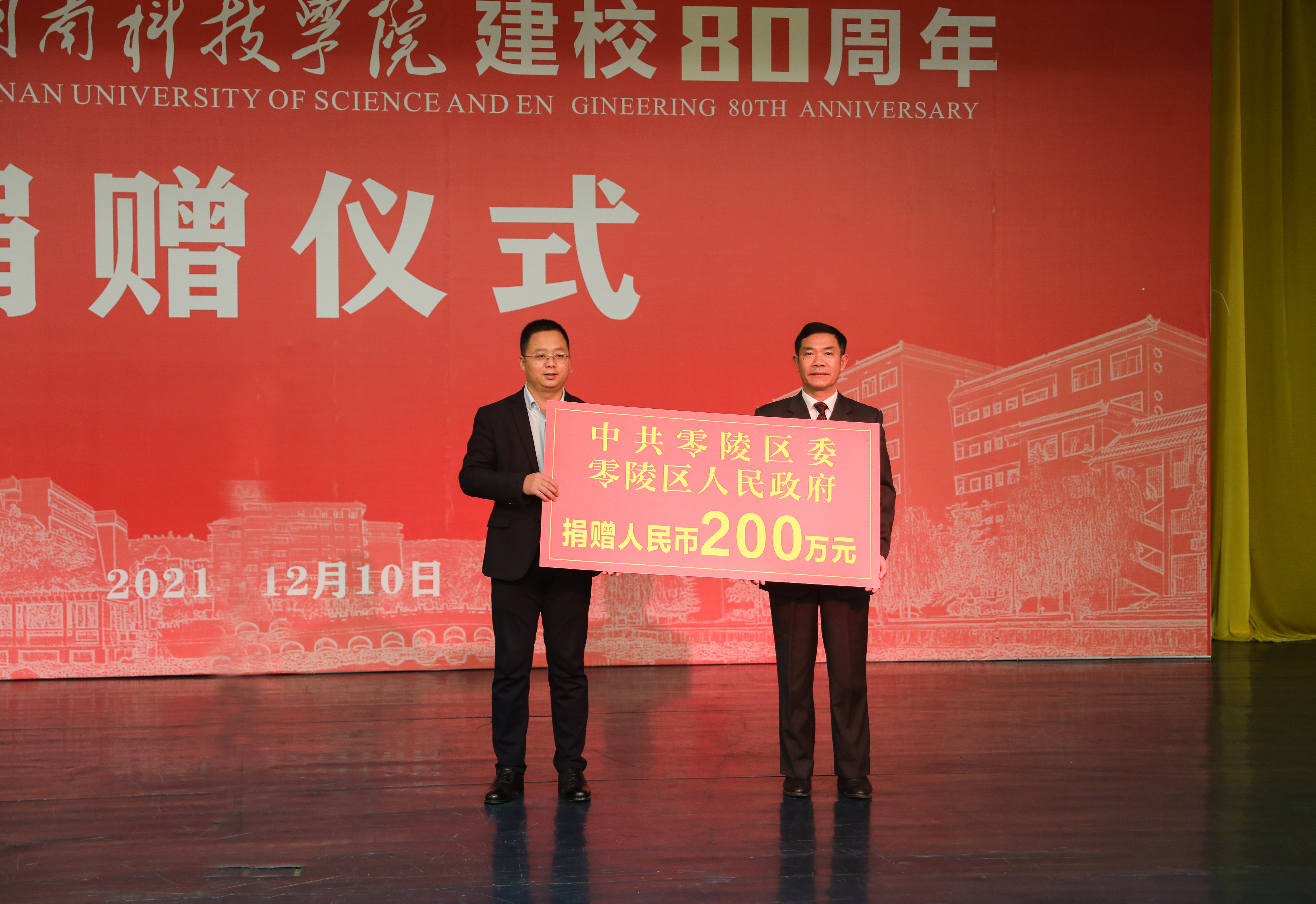 本网讯(记者 唐敏杰)12月10日下午,我校举行建校八十周年捐赠仪式,地方政府、社会组织和友好人士及校友为学校捐赠物资和现金。零陵区委副书记、区长龙亮,冷水滩区委副书记、区长李辉等地方政府代表,永州科隆房地产开发有限公司负责人周祖钦、永州华阳教育有限责任公司董事长唐湘旗等社会组织和友好人士代表,化学80届张亚红、中文86届贺定中等校友代表,学校党委副书记、校长李钢,党委副书记宋宏福,党委委员、副校长吴小林,副校长郑银芳出席仪式。仪式由宋宏福主持。