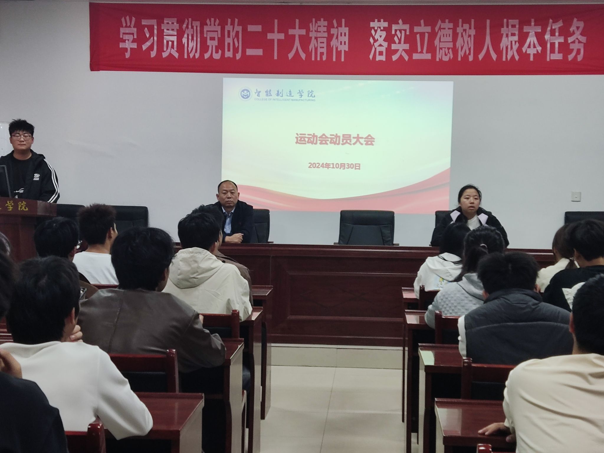 本网讯(通讯员 罗韶涵 周梓翾)为了迎接即将到来的运动会,鼓励运动员积极备赛,充分展示智造院学子奋发向上、勇争第一的精神风貌。学院于10月30日在致远楼103召开运动会动员大会。党总支副书记彭涛凯,学生会指导老师李豆豆,全体参赛运动员和工作人员参加会议。学生会文体部熊帮政同学主持会议。