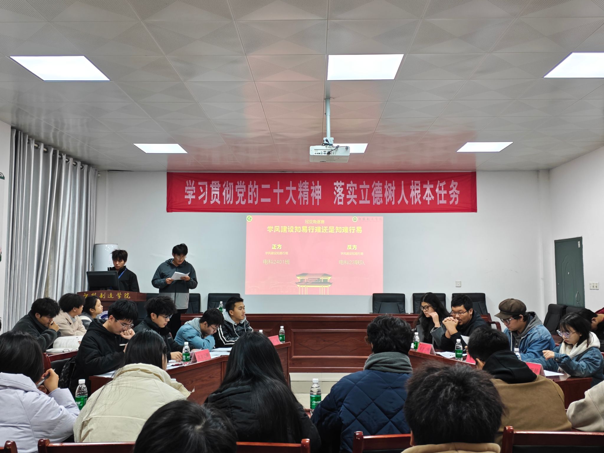 本网讯(通讯员  童钰)12月6日,学院“青春辩途·智启新程”辩论赛决赛在致远楼103举行本次比赛以“学风建设是知易行难还是知难行易”为主题,双方辩手唇枪舌战将气氛推向高潮。