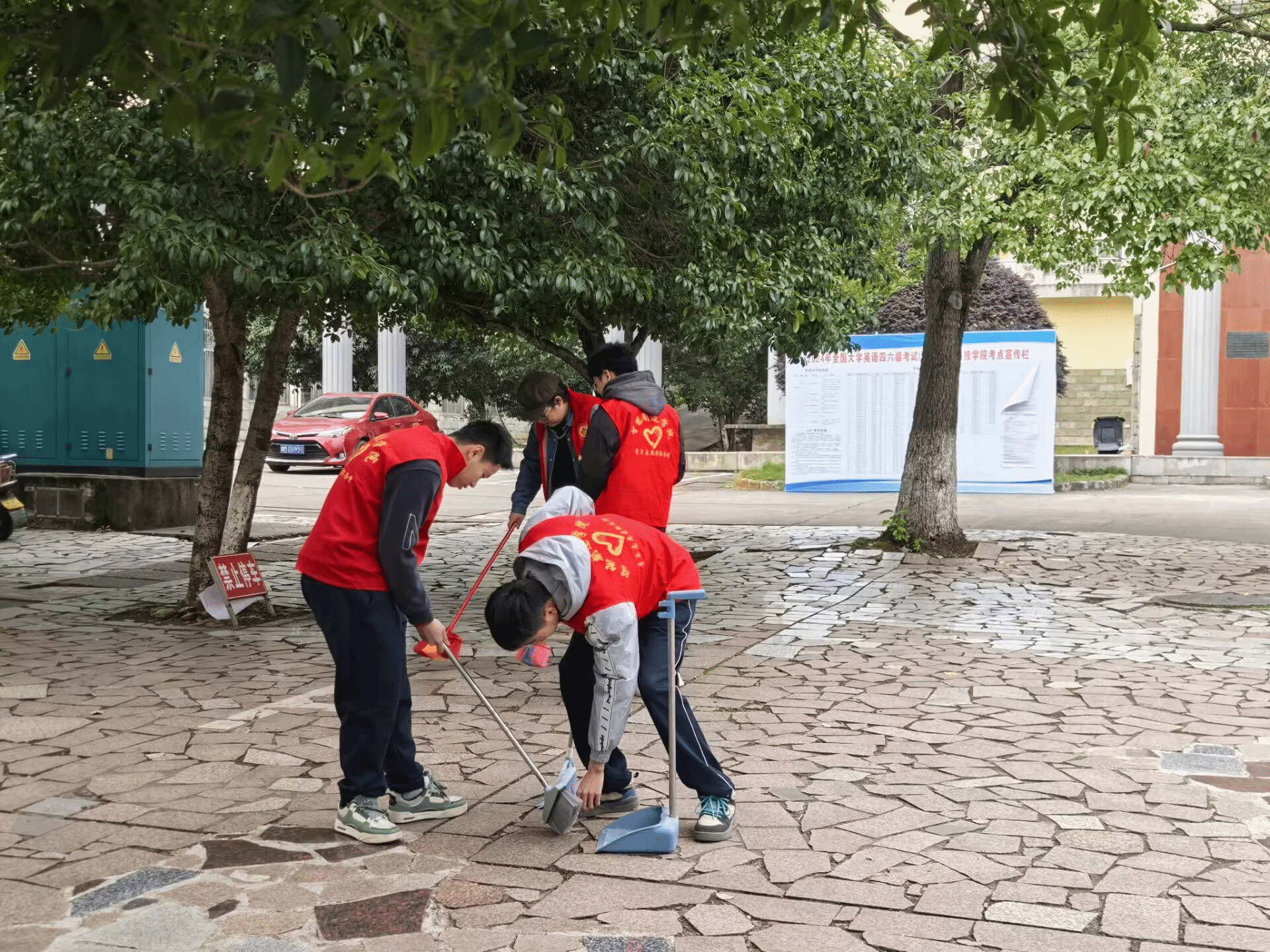 同学们身着统一的志愿者服装,对校园主干道进行了彻底的清扫。经过一个多小时的辛勤劳动,校园主干道焕然一新。