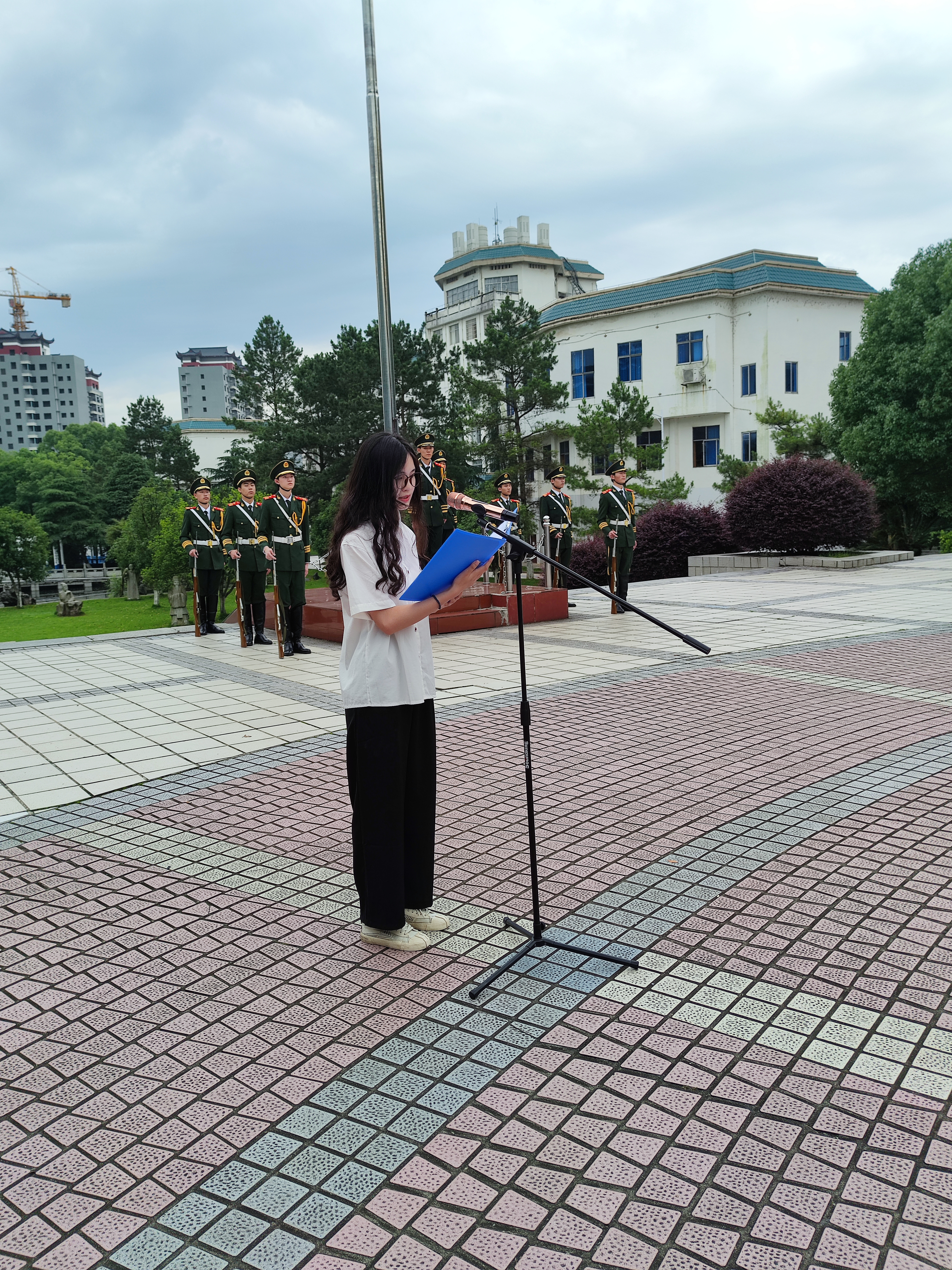 6点50分,升旗仪式正式开始,国旗护卫队护送五星红旗入场,随着《义勇军进行曲》的响起,全体师生齐唱国歌,面向五星红旗,行注目礼。