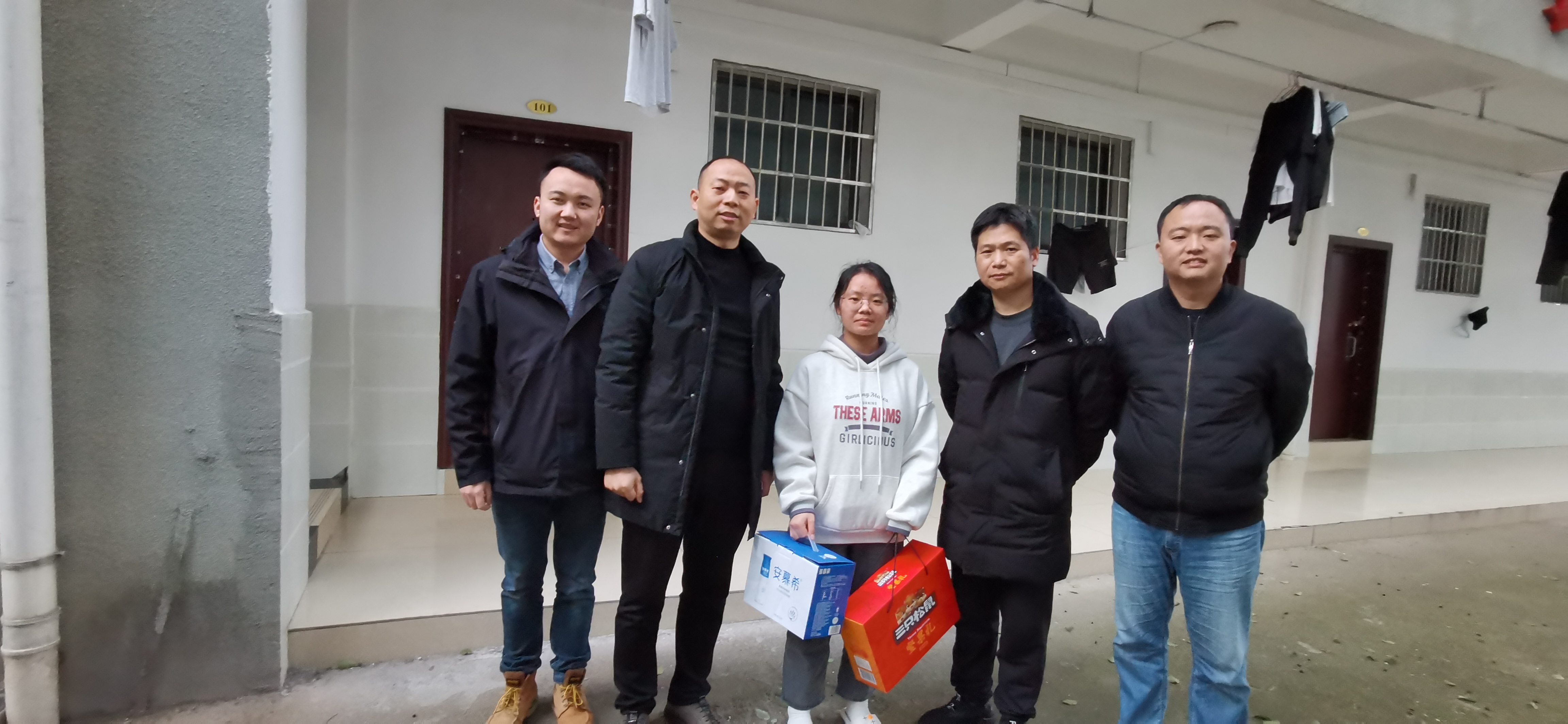 本网讯(通讯员 康平)寒冬慰问寄真情,浓浓关爱暖人心。2022年1月19日,学院党总支书记谭永宏教授带领学院党总支副书记彭涛凯、机械系主任罗哲和学工办副主任、2021级辅导员康平等人来到荷园五栋306学生宿舍,看望慰问学院因疫情无法回家的电科2101班曹津瑶同学,代表学院致以亲切关怀,并送上精心准备的大礼包。