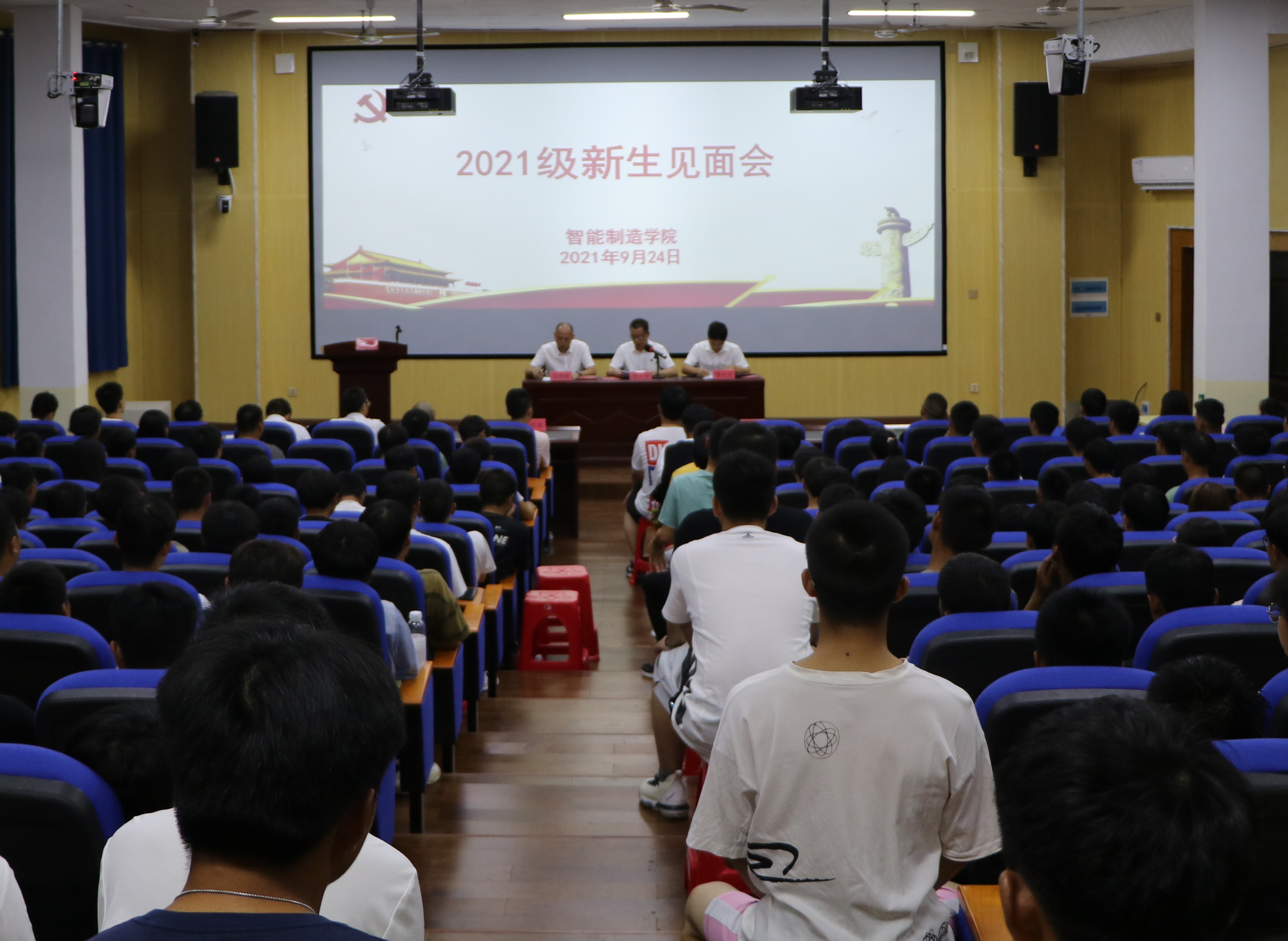 本网讯(通讯员 罗军)2021年9月24日晚,学院在博雅楼西三举行2021级新生见面会。学院领导、各教研室主任、全体辅导员及新生班主任参加见面会。党总支副书记彭涛凯主持新生见面会。