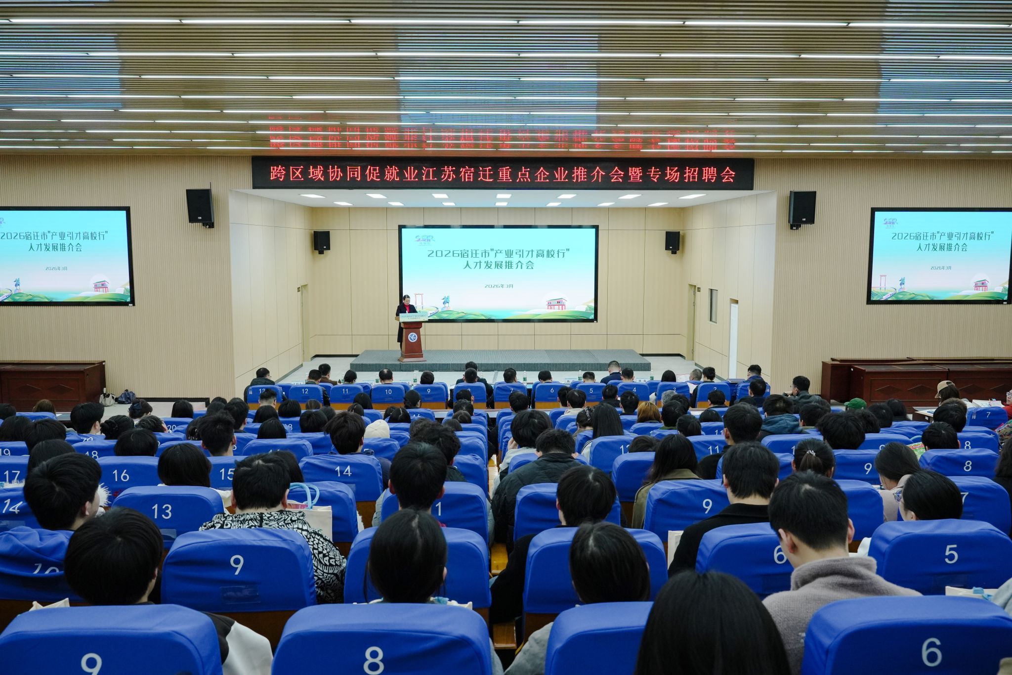 本网讯(记者 逄宇鸣 蔡汝佳 摄影 谢志豪)“非宿迁籍学子求职免费入住宿青驿站”“为普通高校本科生发放生活补贴3万元”……3月24日,2026宿迁“产业引才高校行”人才发展推介会在我校举行,我校党委副书记、校长黄创霞,副校长郑银芳,宿迁市人力资源和社会保障局局长钱信松,永州市人力资源和社会保障局副局长陈巍等领导出席活动,吸引千余名我校学生现场求职。这场别开生面的推介会,体现了宿迁和永州两地跨区域引才招聘的深度联动。